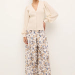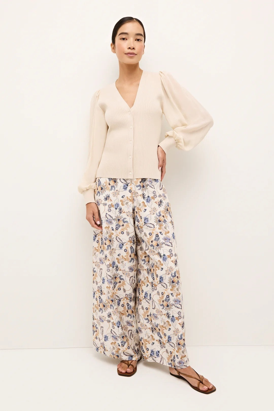The classic cardigan gets an elegant upgrade with the addition of a fitted ribbed bodice and full semi-transparent sleeves cut from 100% silk. This winter white Porcelain hue is quickly becoming a seasonal staple, and we love the breezy look of styling her with our wide-leg Solange pant.