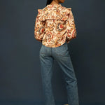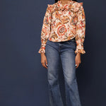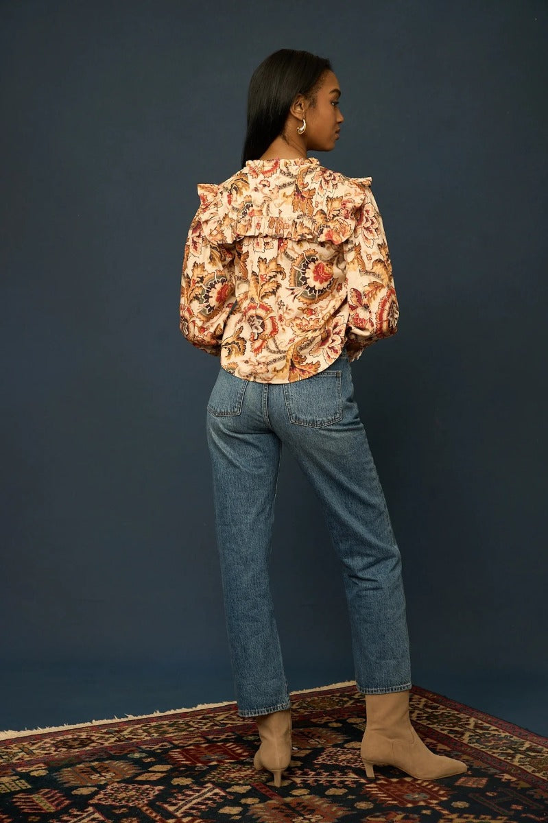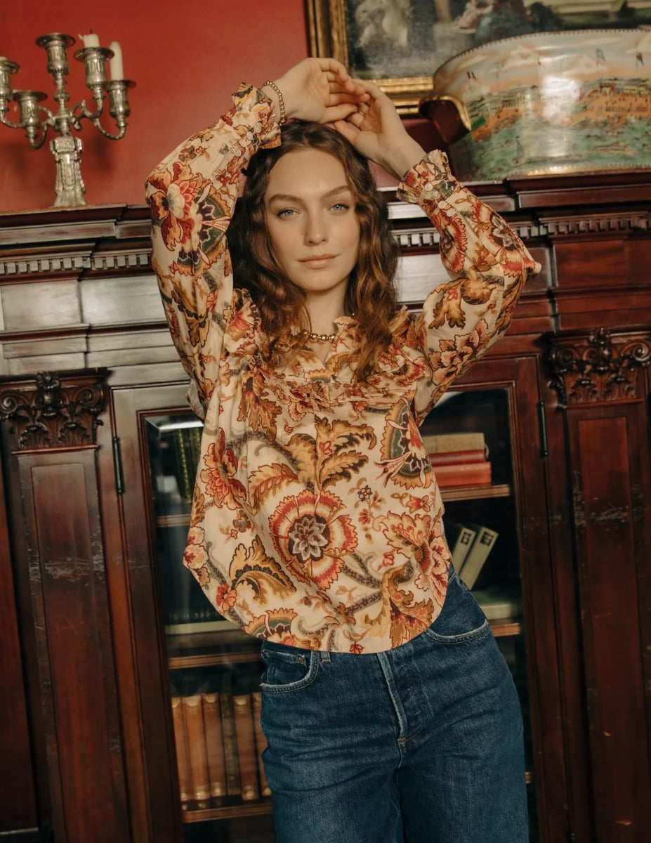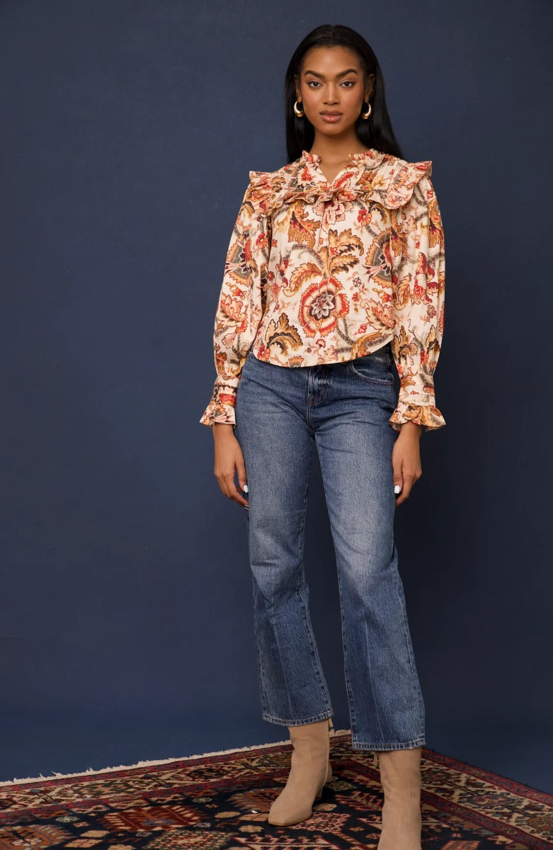 This Tallulah Top will brighten up any outfit with its detailed, colorful floral print that radiates elegance. A lovely, romantic silhouette is created by the distinctive ruffled neckline. The top's feminine charm is further enhanced by cuffs with ruffles along the long, voluminous sleeves. This top offers adaptable style with a distinct, timeless flair.