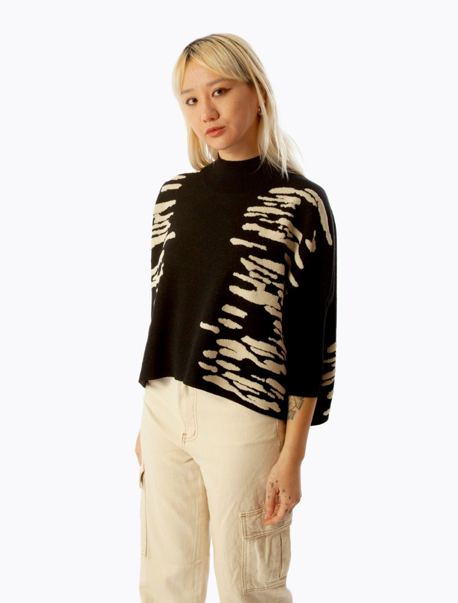 Oversized boxy mock neck top with fitted rib sleeves in double knit abstract tiger stripes pattern.
