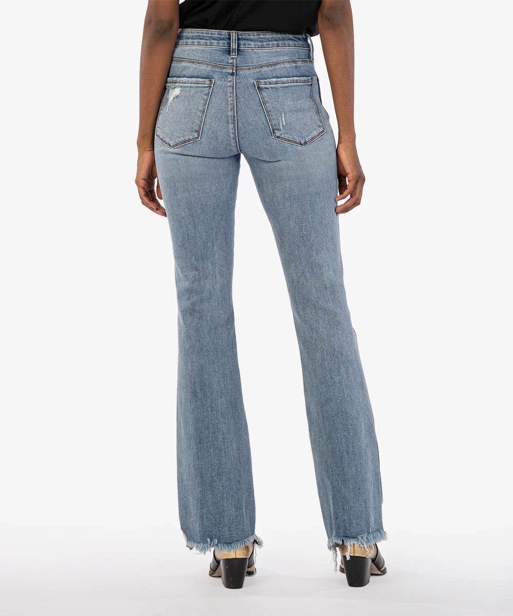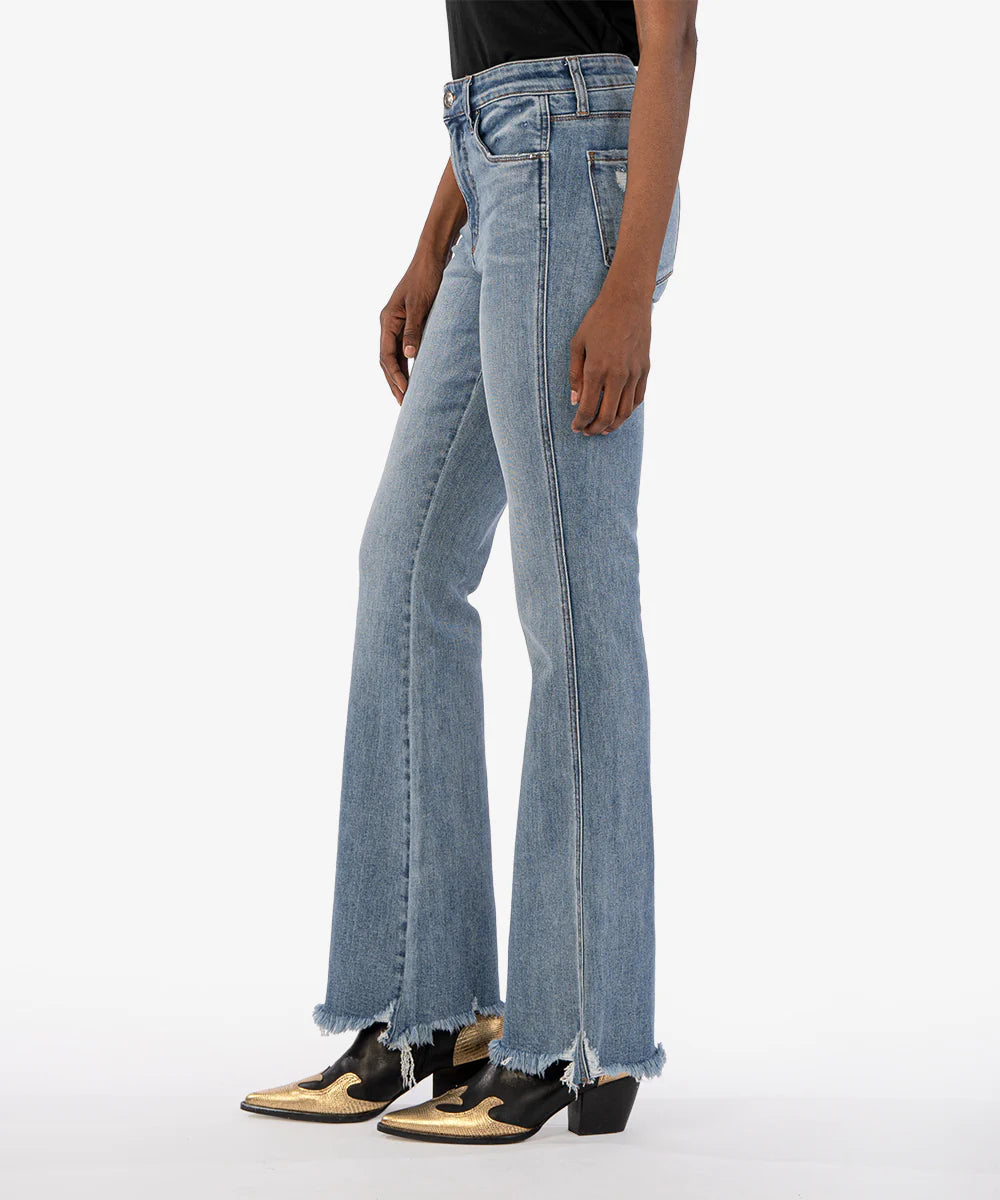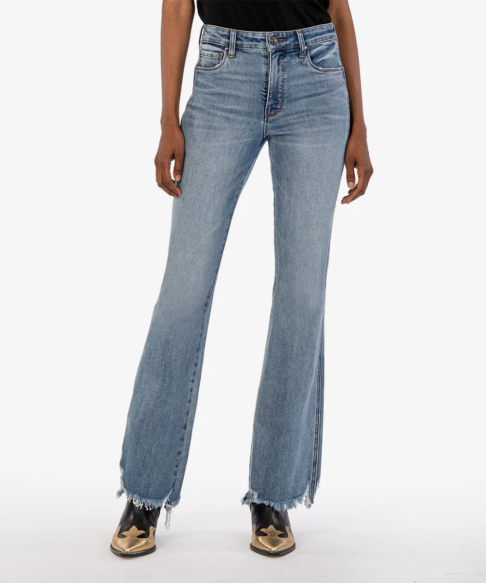 A casual classic, these floor-grazing flare jeans complement your figure with faded stretch denim, raw hems and Fab Ab front pockets that shape and slenderize.