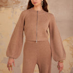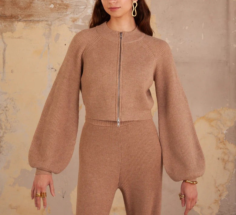 Mock neck zip up jacket with bishop long sleeves in fine rib stitch.