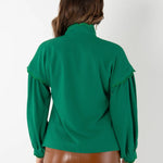 The Orchid Top in Green Jacket is a statement in feminine detail and effortless wear. Designed with delicate scalloped edging along the neckline, shoulders, and cuffs, this style features blouson sleeves and a relaxed, easy silhouette. The vibrant green hue brings a fresh pop to your fall wardrobe while remaining versatile enough for endless styling across seasons and occasions.