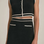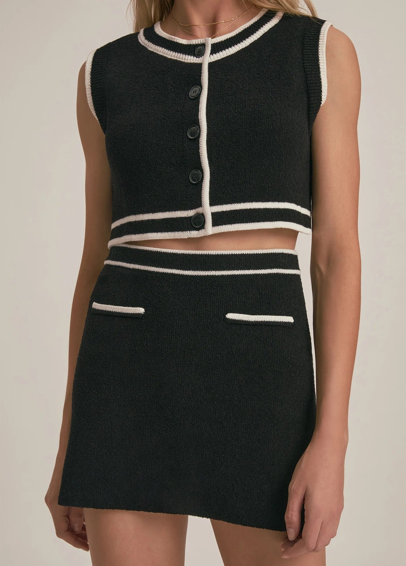 Whether you're pairing it with a simple white tee, your favorite tank or the matching top The Meredith Skirt is so easy to wear. Cut from a soft cotton knit, this A-line mini measures 15.75" and has the perfect contrast trim for a little extra detail.