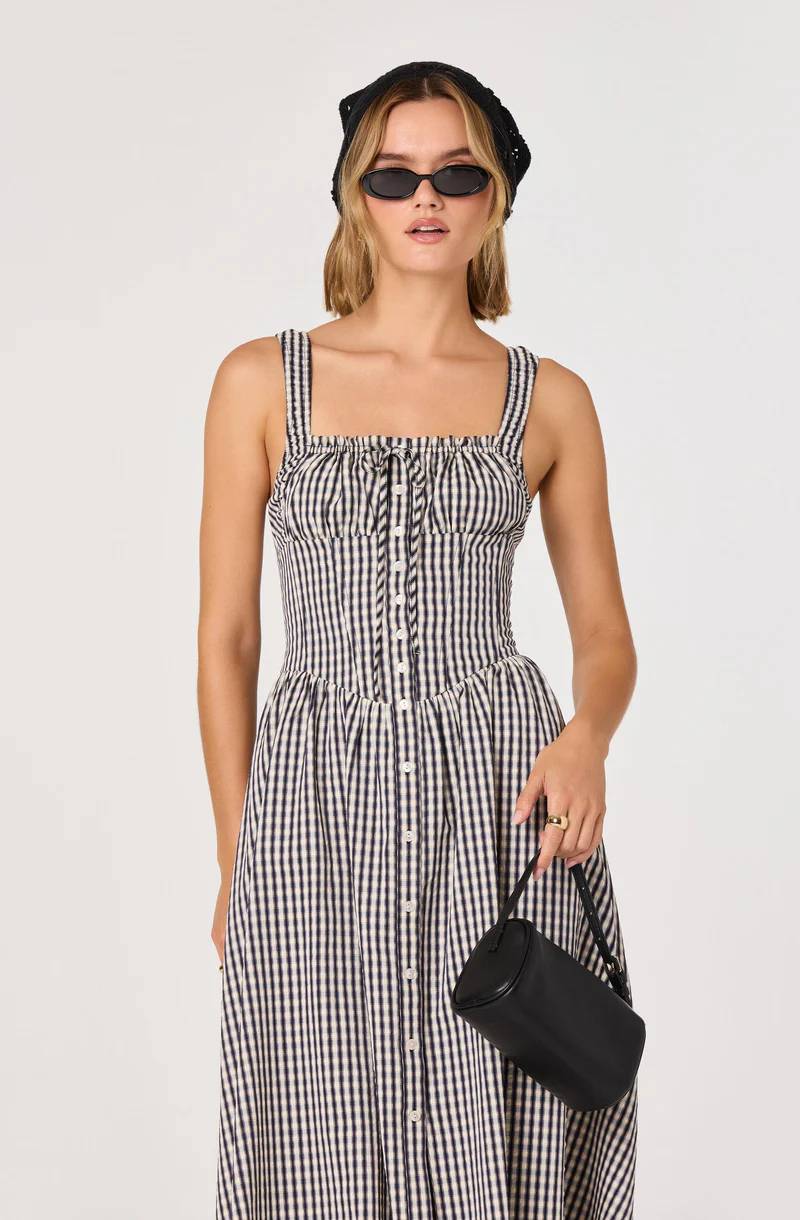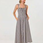 Classic gingham checks meet countryside charm in this breezy maxi dress with adjustable details throughout. Hidden side pockets and a full button-front make it as practical as it is pretty.