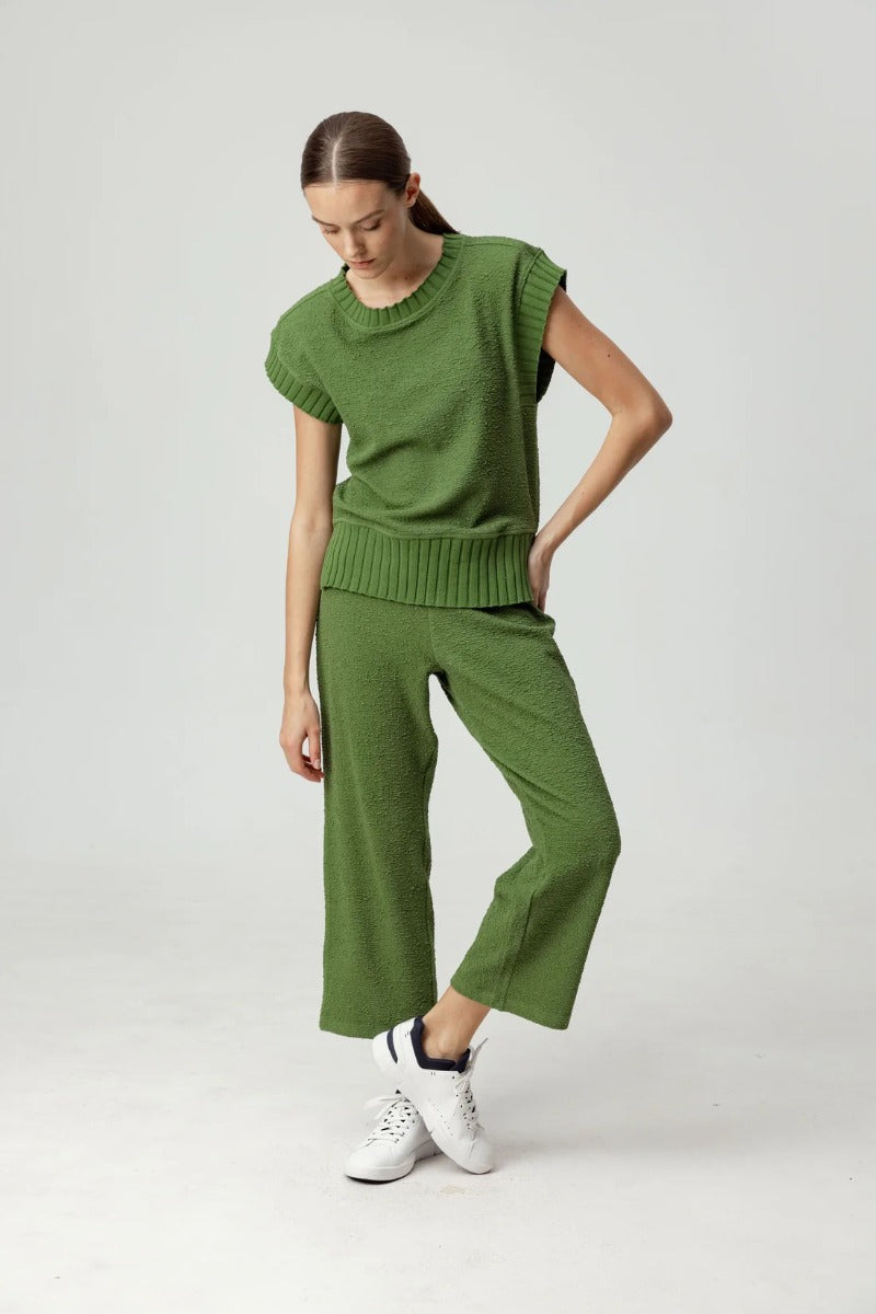 Made in our best-selling crinkle terry, the Thalia pants have a relaxed and effortless fit. A pull-on pant that is perfect for lounge or travel, Thalia features a straight leg that finishes at your ankle. It features a ribbed waistband made from our lux sweater rib fabric. Shown styled with the matching Maeve pullover.