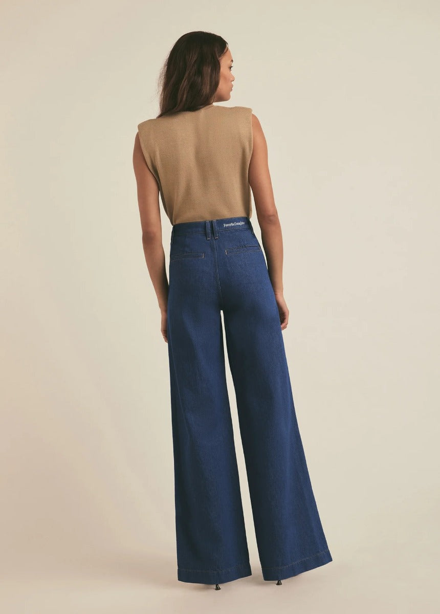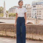 The super high-rise, wide leg Fancy Mischa makes a statement in Rome, a dark-medium blue rigid denim that just gets better over time.