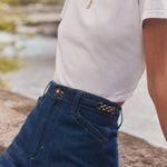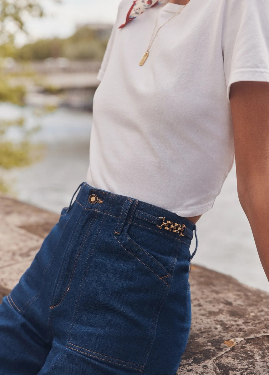 The super high-rise, wide leg Fancy Mischa makes a statement in Rome, a dark-medium blue rigid denim that just gets better over time. It features wide slant patch pockets, fancy gold chain trim along the side waistband and utility back patch pockets. Add The Boulevard Trench in matching Rome wash to create one of our favorite denim looks.