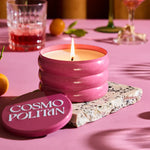 Chic and captivating. Boldly bewitching. Inspired by the pulsating energy of New York City's nightlife and the iconic presence of the 90's cocktail scene, this fragrance encapsulates the essence of the Cosmopolitan with notes of tropical hibiscus, tangy cranberry, and zesty blood orange. Encased in a vibrant, cranberry-pink colored tin, the candle exudes sophistication with a playful twist.
