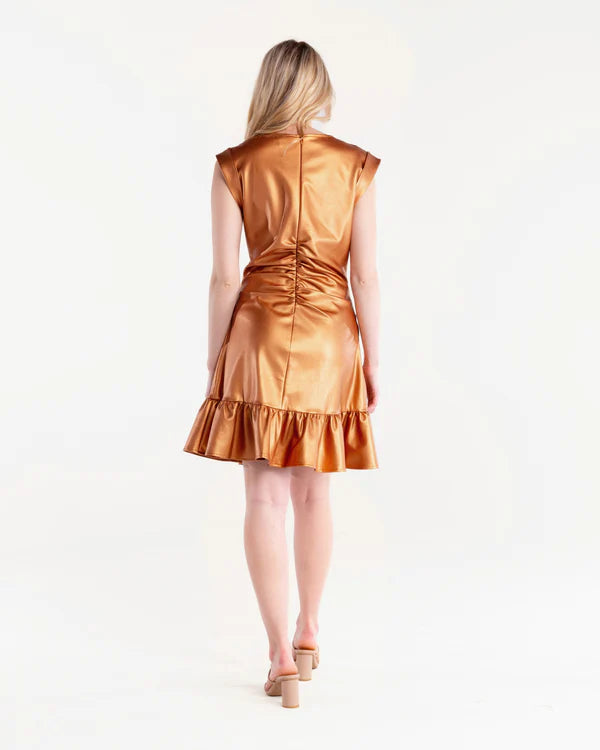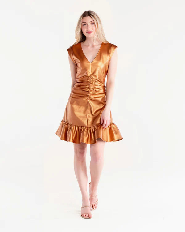 Elevate your style with this trendy dress featuring ruched detailing and a playful ruffle hem.