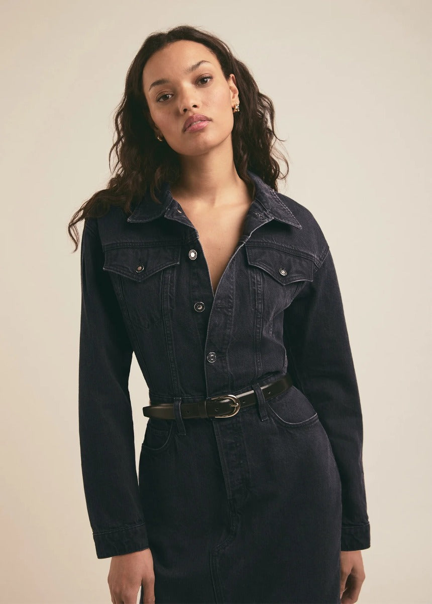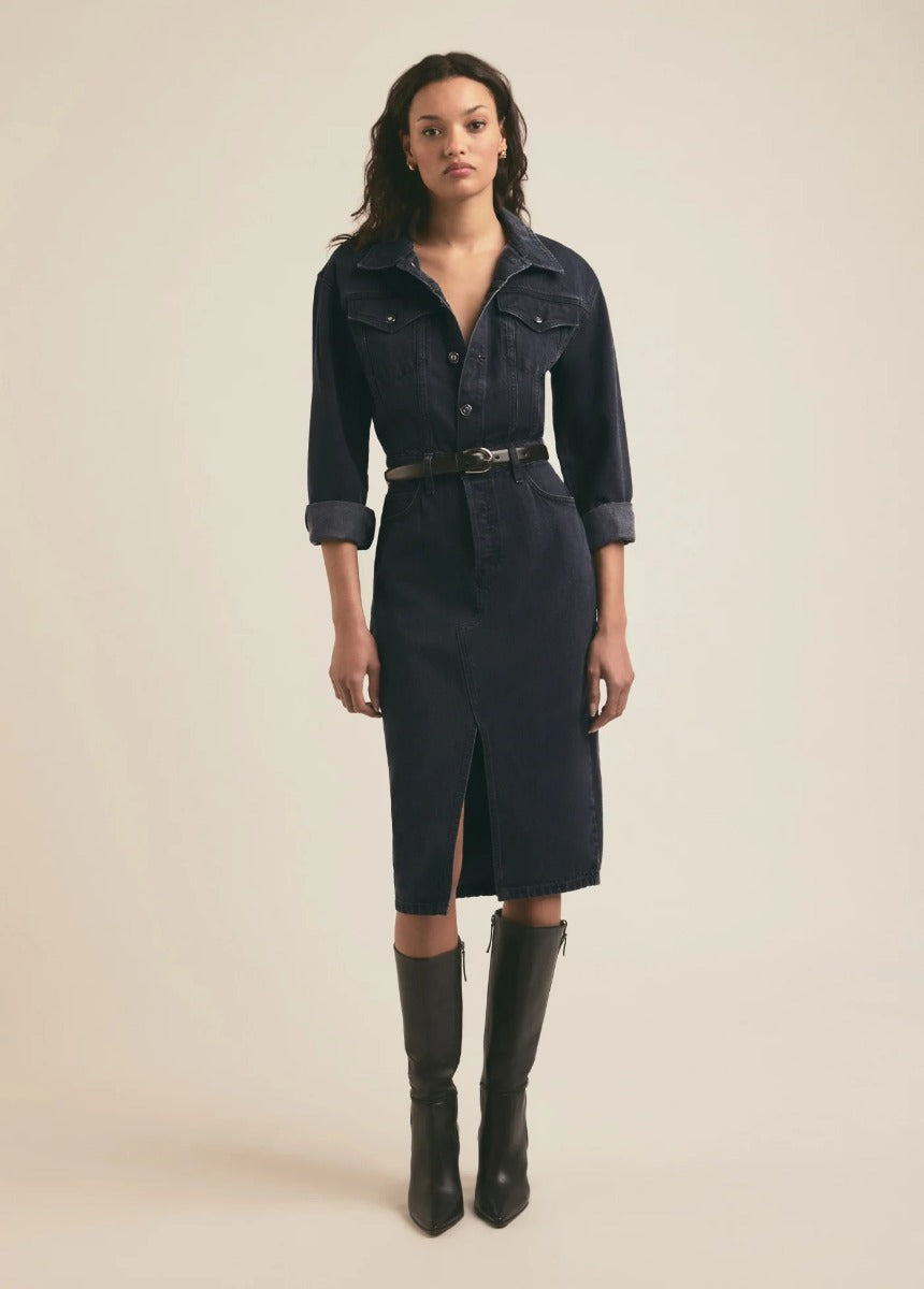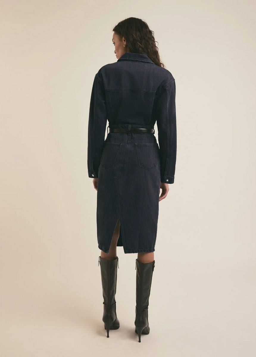 Set in faded black denim, The City Dress is so much more than sidewalk chic. The long sleeve, button up dress has a cinched waist with a dropped shoulder and looser fit on top that's balanced by the mid-calf pencil skirt with front slit. We especially love the traditional 5-pocket skirt styling--including a hidden button fly. (Favorite Daughter waistband embroidery too, of course.)