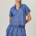 The Corinne Shirt features delicate ruffle detailing at the neckline and intricate embroidery along the scalloped hem and sleeves. Feminine and versatile, it's a charming addition to your warm-weather wardrobe. The fit is relaxed through the body with the length sitting just at the top of the waistband of your favorite high-rise jeans. Pairs effortlessly with the Felice Skirt.