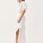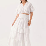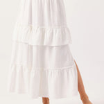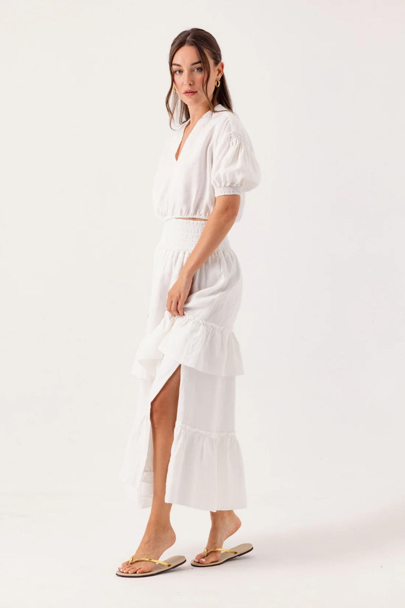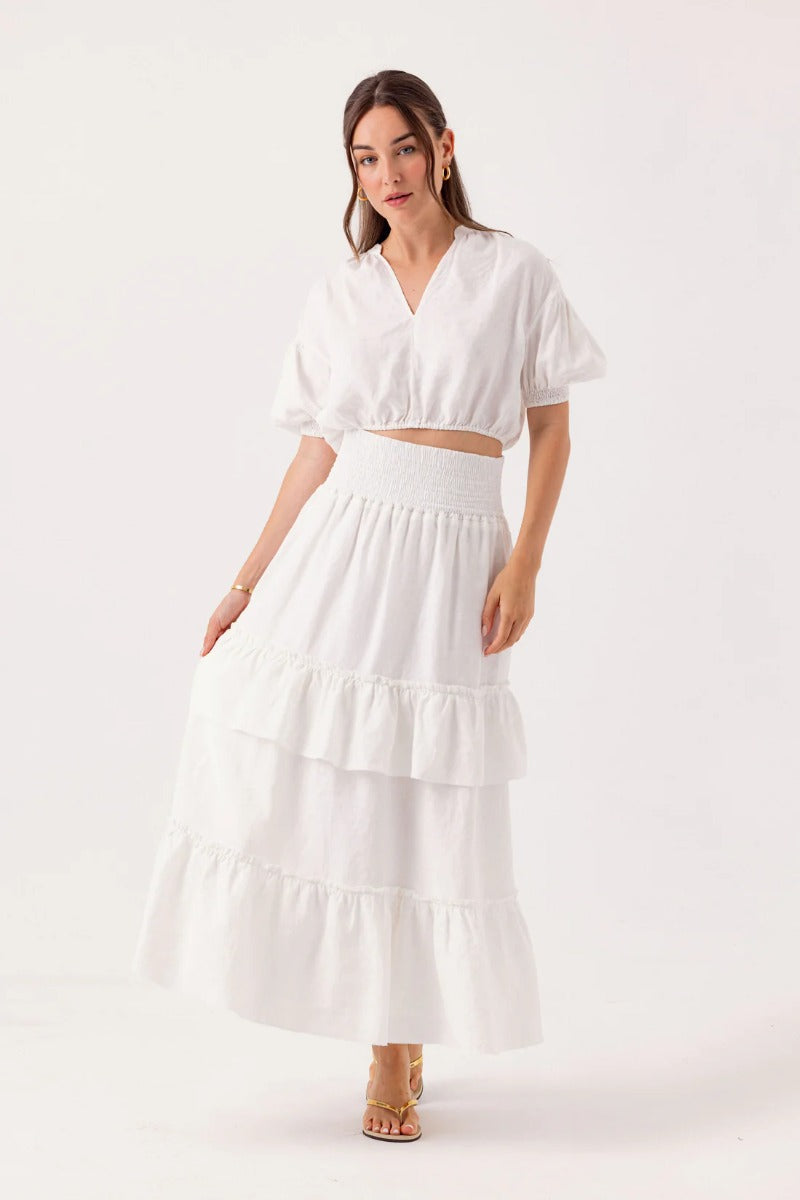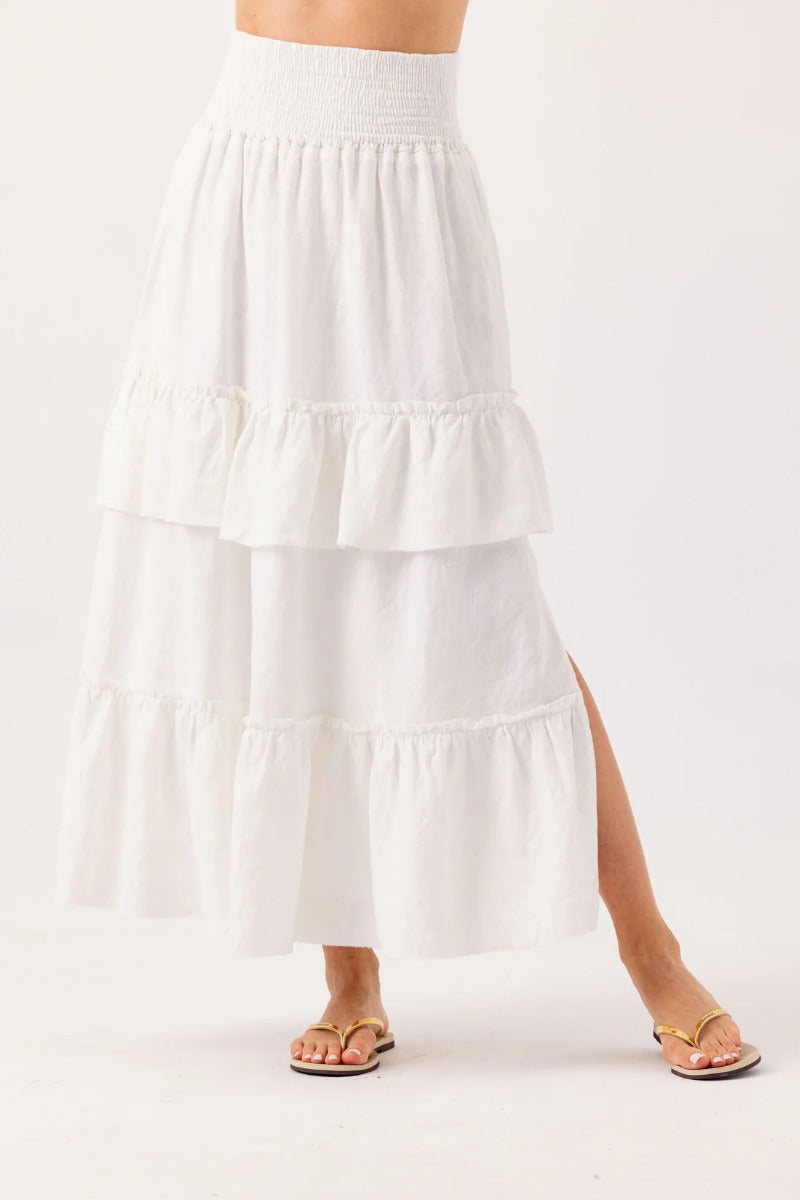 Meet the Yara skirt. Made in our washed lux linen fabric, Yara has feminine flowing tiers that cascade from a cinched elastic waist, creating the perfect shape from your waist through your body. This skirt is sure to turn heads wherever you go. Each tier is trimmed with feminine ruffles, and a side slit makes Yara perfectly flirty.