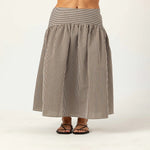 This season’s lurex stripe comes in a monochromatic design touched with a subtle gold detail for a soft, refined shimmer. The classic maxi skirt is updated with an elongated asymmetric waistband that creates a slimming line and gentle gathers for an elegant drape. Finishing at the ankle, it offers a full, graceful fit through the body.