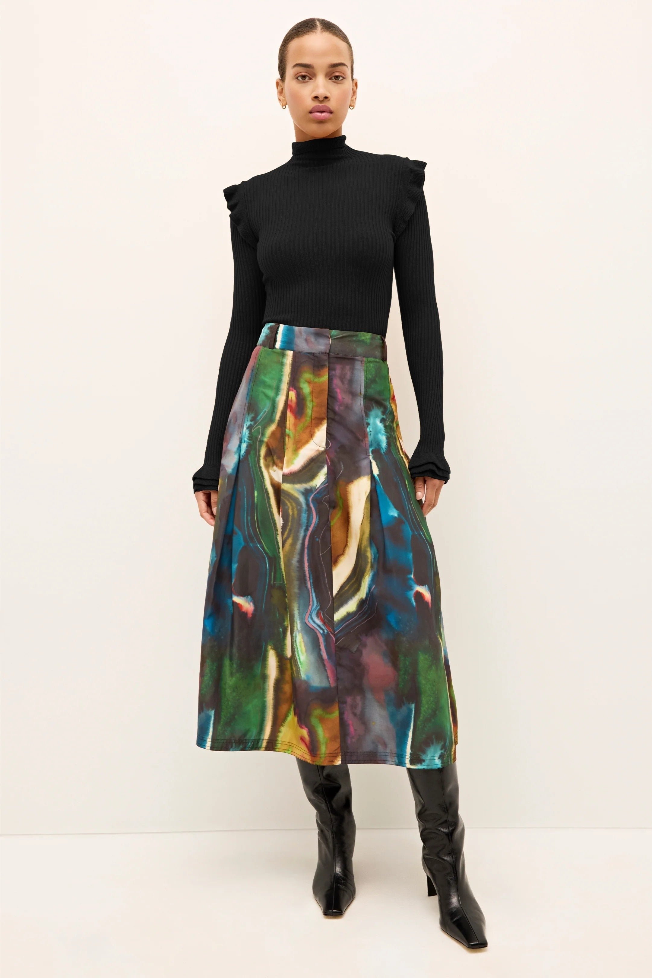 Faith is a tailored midi skirt defined by a fixed waistband and feminine box pleats that add movement and a slight flare.
