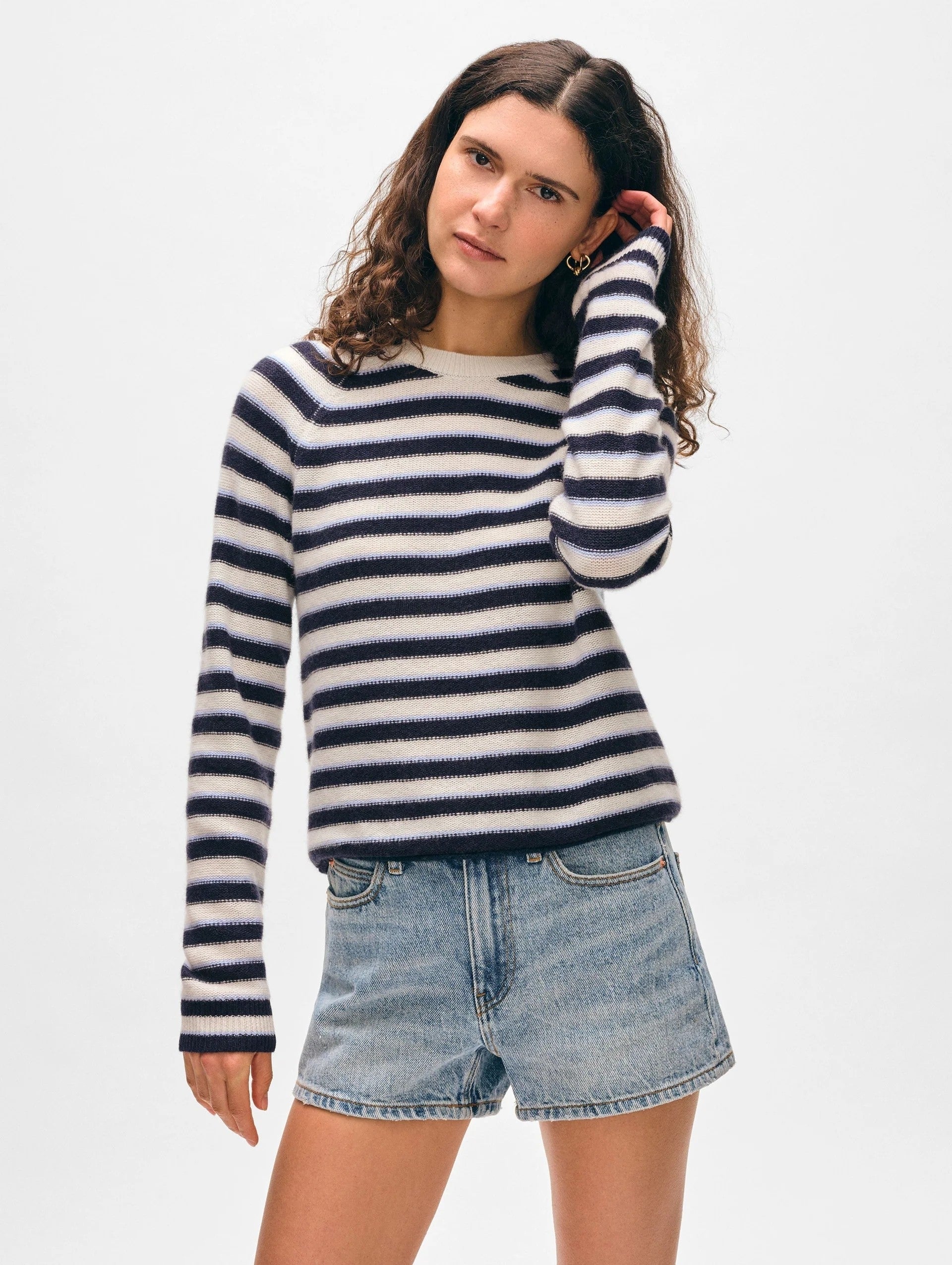 This 100% cashmere sweatshirt features a chic tri-stripe pattern. Its straight fit and raglan sleeves drape comfortably, creating an effortless silhouette. Knit in a classic weight, it's the ideal transitional piece.