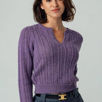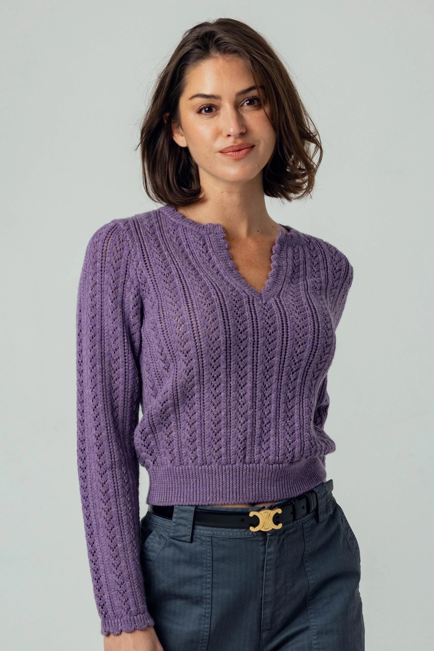 Our signature layering essential, but elevated: The Seychelle Sweater is crafted from a soft, breathable yarn in a delicate pointelle stitch. It features a scalloped plunging V-neckline and a slightly cropped fit that hits right just past the waist. Lightweight yet cozy, it's perfect layered over a button-down or worn on its own for a softer take on transitional knits. True to size, Seychelle is designed to sit right at the waistband of your favorite mid-rise jeans.