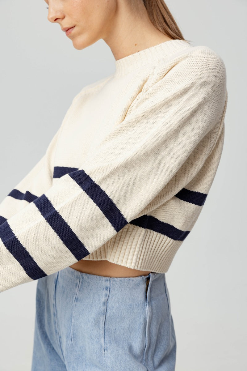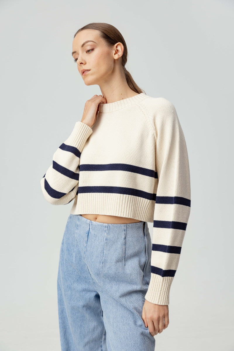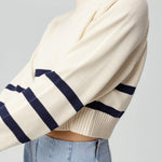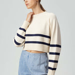 Introducing the Enid sweater: the perfect combination of casual and chic. Crafted in 100% cotton yarn for optimal comfort and style perfect for early fall. This boxy crew neck fit sweater features navy stripes along the bottom of the body and sleeves with rib trimmed cuffs, hem and neck.