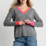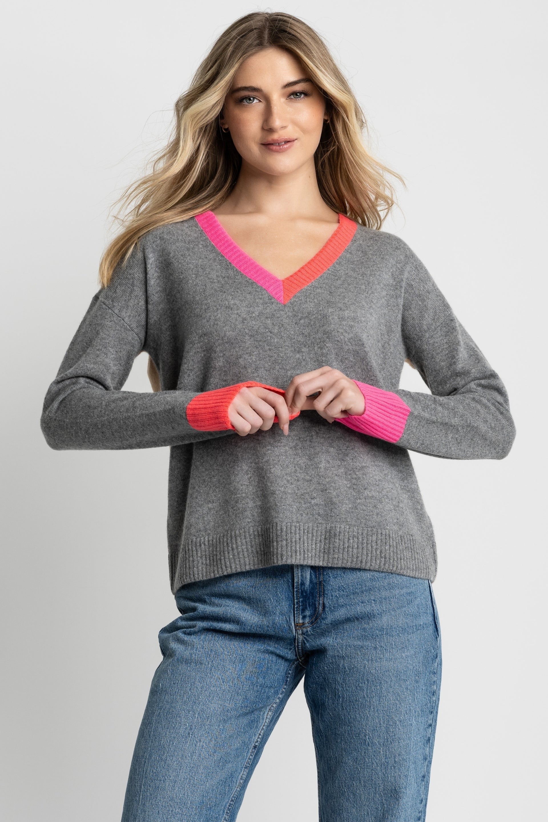 The Color Wheel sweater reimagines the classic V-neck with artful colorblocking at the cuffs and back. Knit in 100% Cashmere, this relaxed silhouette features drop shoulders and refined ribbed finishes for a wearable, everyday statement. A bold twist on a timeless staple.