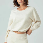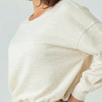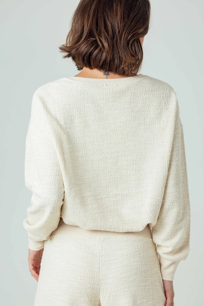 Made in our knit boucle fabric that is lightwieght with Textured comfort. Meet: Miri. It features an adjustable elasticized hem, allowing for versatile styling, and a slightly open crew neckline that beautifully frames necklaces. Billowy long sleeves add subtle volume, while the relaxed fit through the body ensures ease (sizing down offers a more fitted look) Slightly cropped, it's designed to sit at your natural waist, making it perfect with high-waisted favorites.