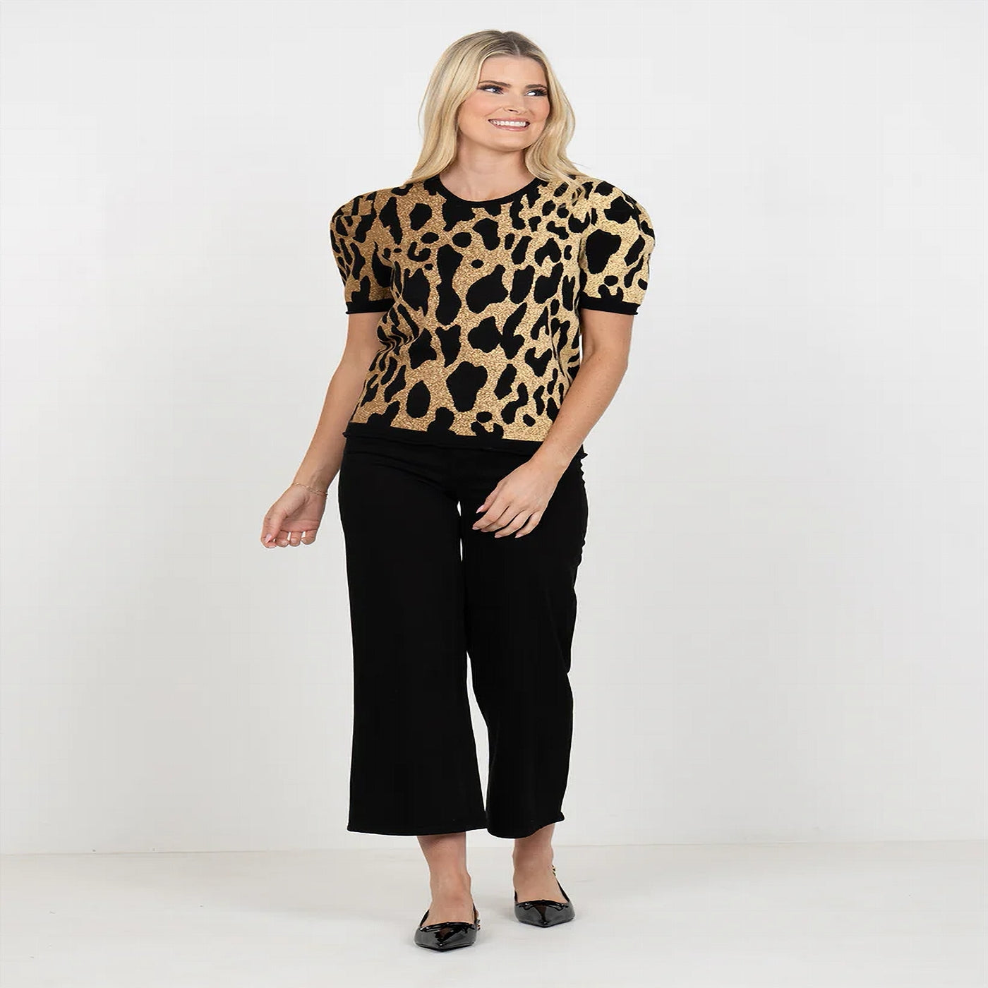 Timeless with a touch of fierce sophistication, the Crewneck Knit in Lady Leopard is a refined take on the classic animal print trend. Designed with a round neckline, subtle puff short sleeves, and a slightly tailored fit, this knit flatters effortlessly while keeping comfort at the forefront. Easy to style and endlessly versatile, it’s the perfect piece to bring a polished yet playful edge to your everyday look.