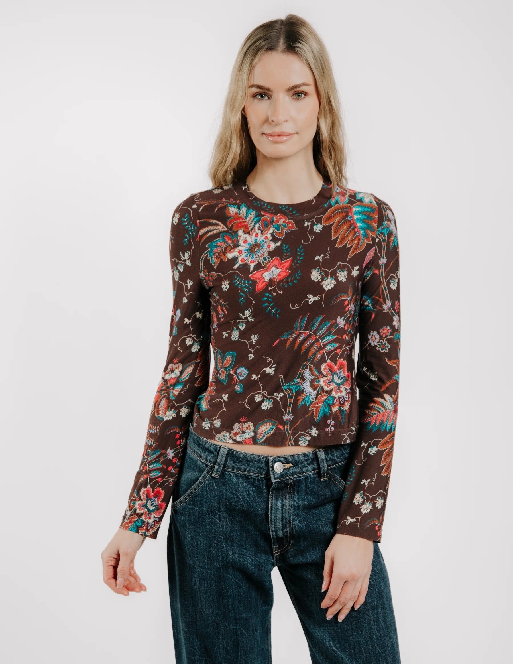 The Sarafina Tee in Charlotte Floral Print in our signature buttery soft knit jersey wears effortlessly for everyday. A versatile layering piece that pairs seamlessly back with denim, chocolate, and cognacs.