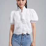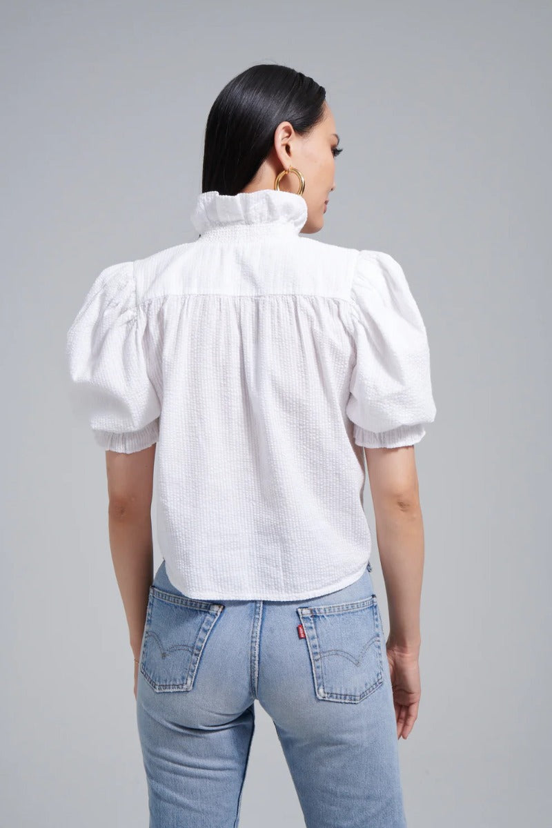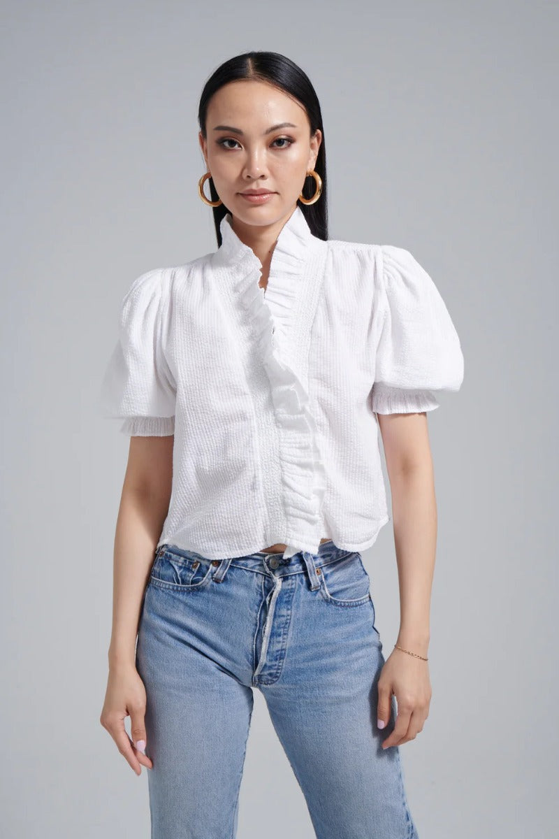 The Zuri top features smocked ruffle detailing and a button down front, with slight puff sleeve.