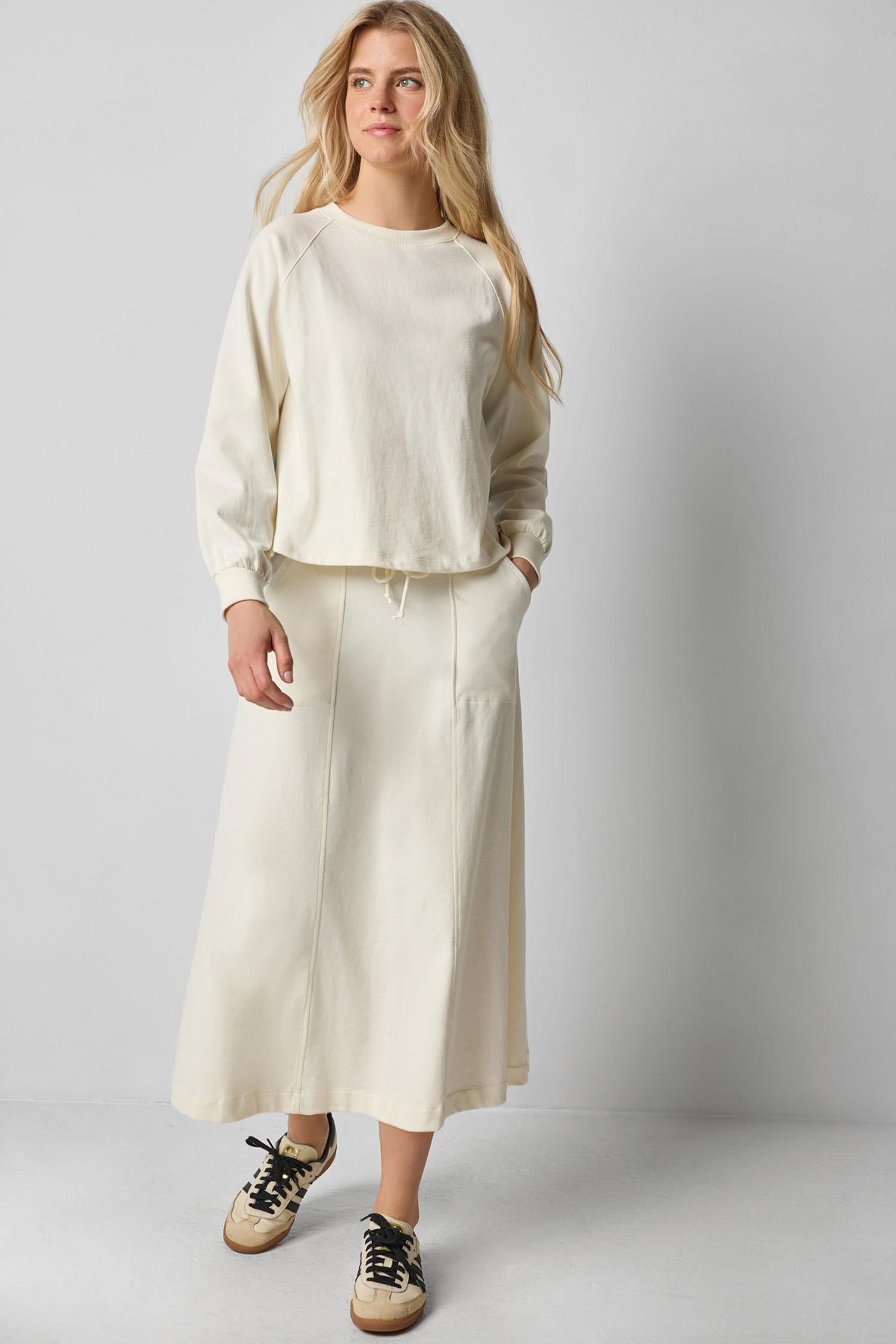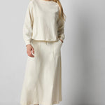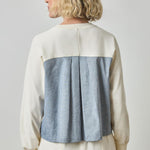 The Chambray Pleat Back Pullover offers a modern twist on the classic sweatshirt. Made from a structured mid-weight jersey, it features a crew neck and ribbed cuffs. A pleated chambray panel at the back adds fluidity and a distinctive mixed-media touch.
