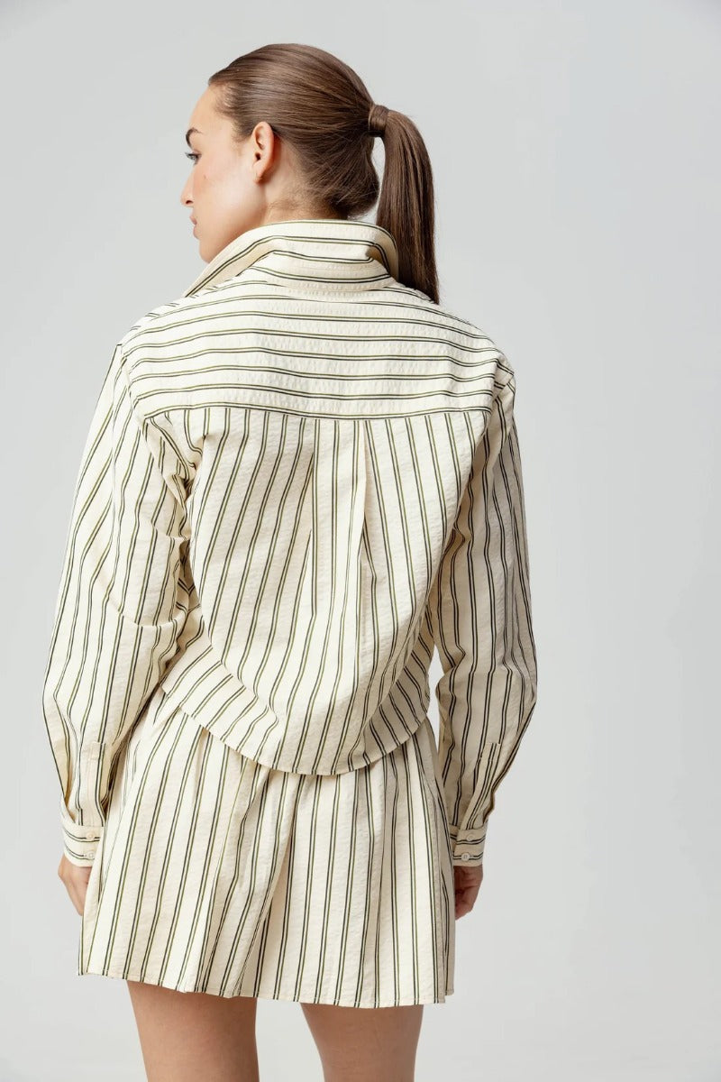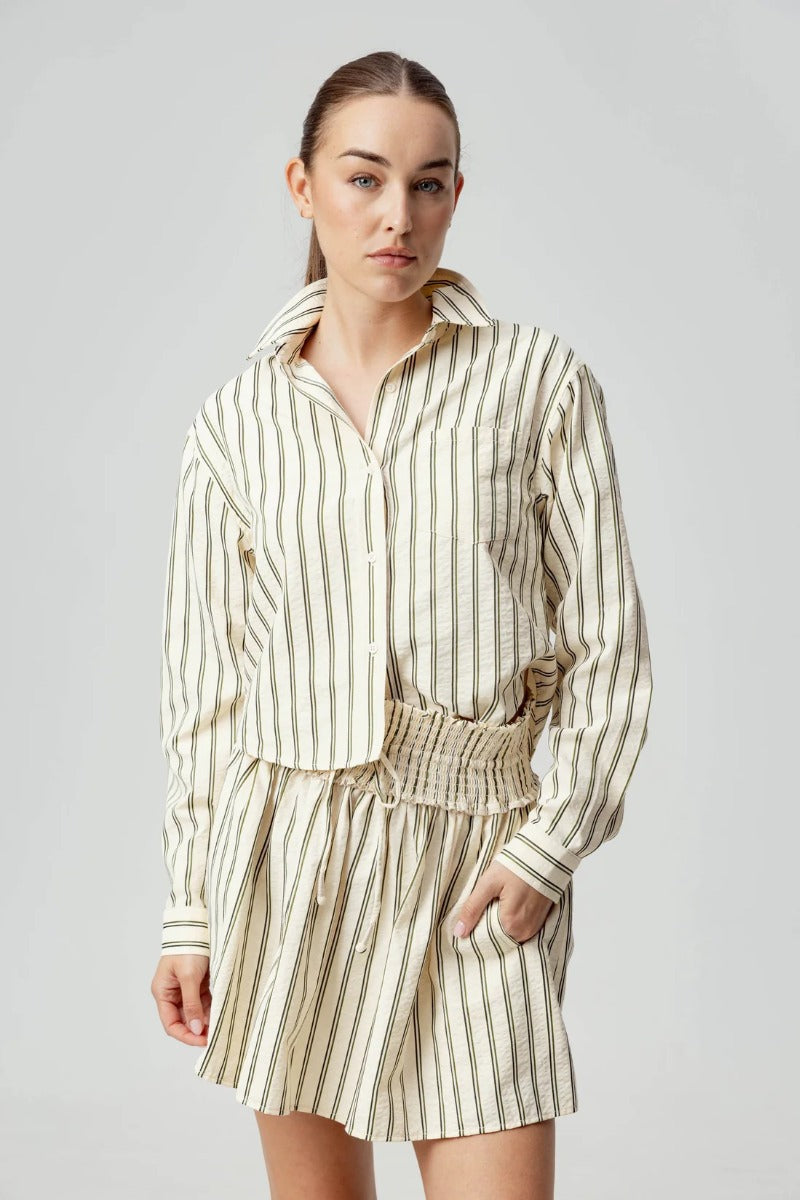 If you liked our Charlie skirt, than the Vada shirt was made for you. A boxy fit through the body and the perfect slightly cropped length, this is the perfect shirt for layering. Not meant to be slim fitting through the body, the back pleat creates a little swing through the body, making this top fit wider through the body. The slightly cropped length makes this perfect for pairing with your favorite high-waisted jeans, or with our Iona skirt as a matching set.