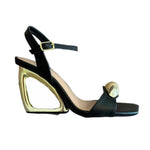 The Affluent Wedge stands out with its unique heel design, highlighted by elegant gold metal accents. An adjustable ankle strap ensures a secure and comfortable fit, making it both stylish and wearable.