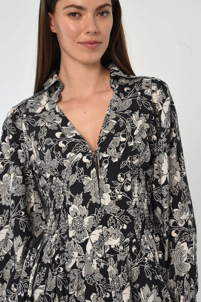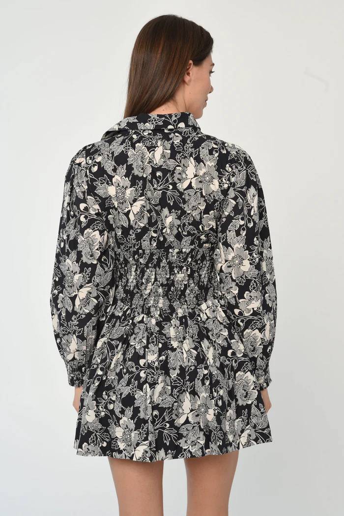 The Gia Mini Dress is Love the Label’s take on a classic shirt dress, with a twist. Offered in our classic Cotton Poplin in the Moonlit Floral Print, the dress features structured details such as a collared neckline and an exposed metal zipper at the center front. Gia also offers comfort with an entirely smocked waistband at the front and back. The skirt is softly gathered and perfect for twirling! Wear it with tall boots or layer with the Neva Jacket for a cool-girl look.
