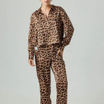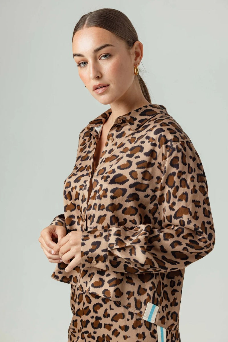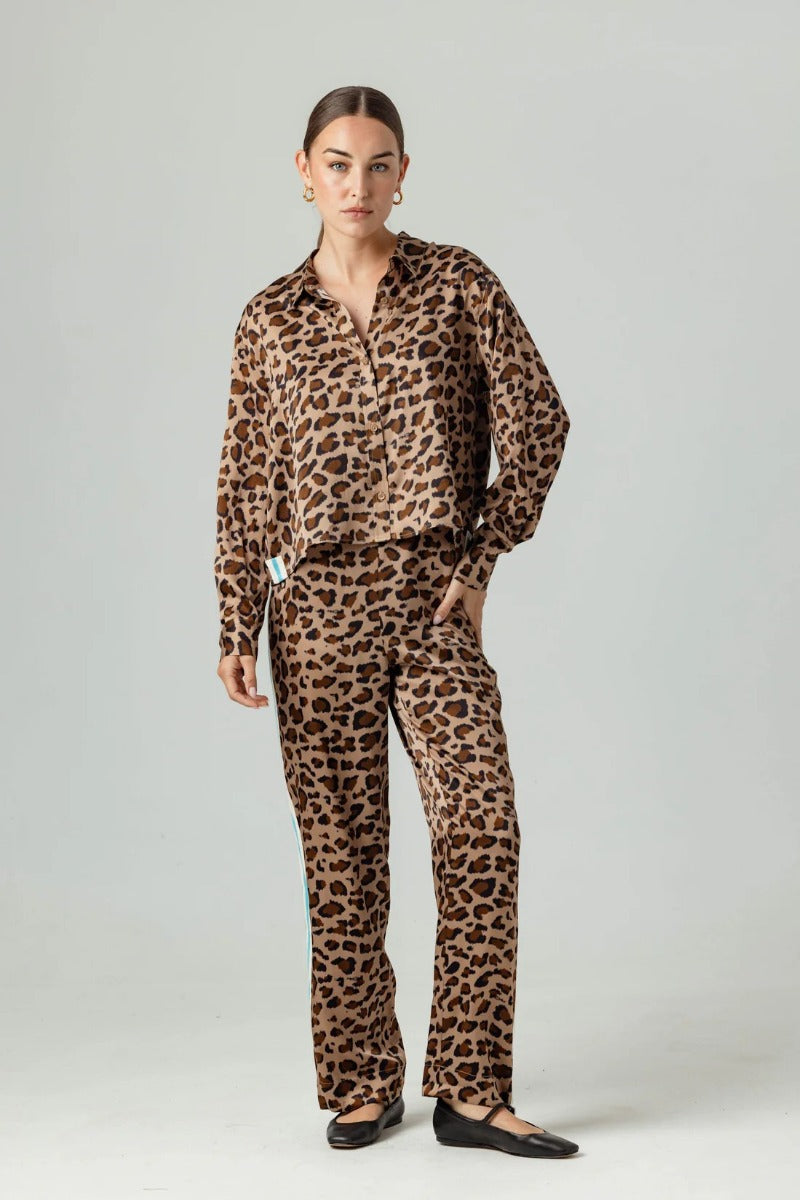 A leopard moment has arrived. Adrina is new this season: a pajama-style shirt with a button-front, classic collar, and stripe trim detail on the side seam. Crop length, Adrina will finish just above the waistband of your favorite mid-rise jeans.
