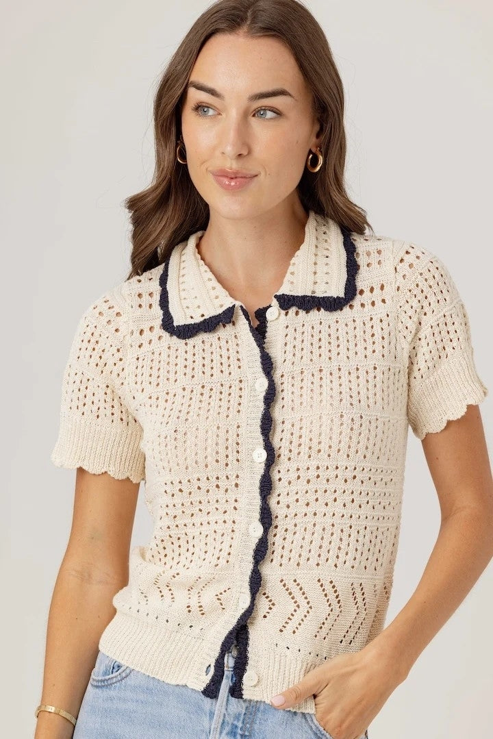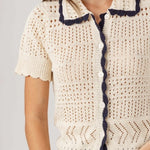 Our sweetest style for summer, meet the Agnes Sweater. Crafted from a breathable linen pointelle knit, this sweater features navy trim along the collar and button-down front for a classic touch. Delicate scallop detailing accents the sleeves, collar, and placket, adding a feminine finish. Perfect with your favorite denim or styled with our solid Linen Penny Shorts for an easy, polished look. The fit is close to the body size up if you prefer a more relaxed, oversized look.