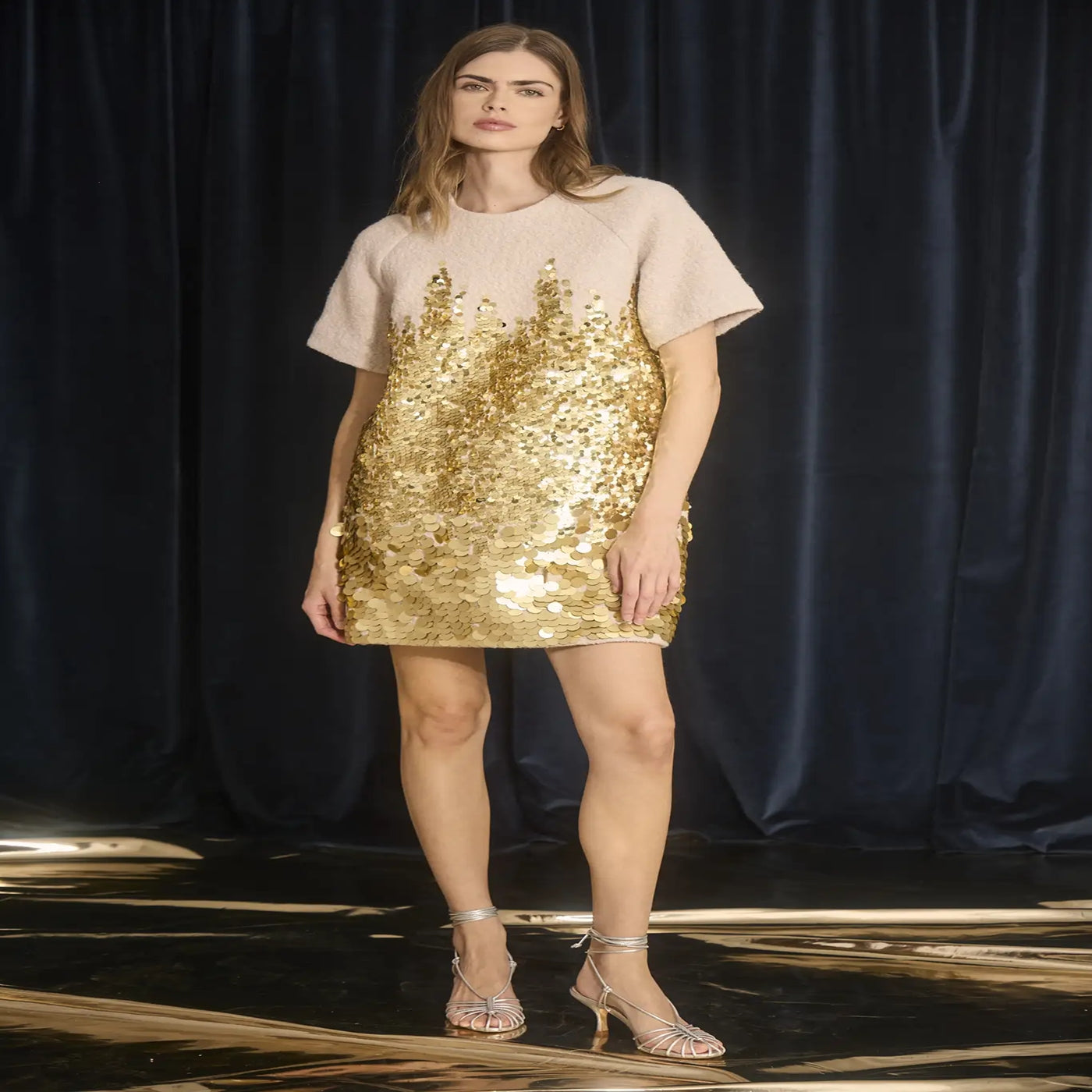 The Aerin Dress in City Lights Gold pairs a clean, minimalist silhouette with striking detail. Crafted from Italian wool embroidered with cascading gold paillettes, this mini shift shines with subtle glamour. Finished with short raglan sleeves and a discreet back zipper, it’s an effortlessly elegant piece for any evening occasion