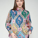 Long sleeve shirt with multicolor floral print in pink, blue, green, yellow and coral. Classic collar, front button closure and curved hem. Straight cut.