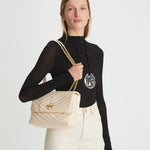 The Kira Convertible Shoulder Bag is made of soft chevron-quilted leather with beveled Double T hardware. An adjustable chain strap adapts in the moment doubled over the shoulder, or long and crossbody.