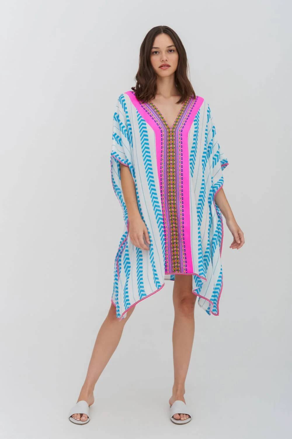 The Mini Thobe is a cropped version of our best-seller – the classic Thobe. This short dress features a flattering deep v-neckline with Inca trim detailed and offers free-flowing flutter sleeves that elegantly fall to the ankles. The drapey and delicate hand-loomed fabric from India feels ethereal and light, so much so that you will want to live in it!
